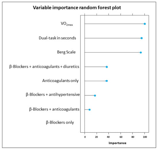 In terms of overall values, the variables of most importance for this model were VO2max (100.000), DT in seconds (94.561) and Berg Scale (93.909), in addition to the use of cardiac drugs, individually or combined, particularly β-blockers + anticoagulants + diuretics (36.426), anticoagulants only (35.987), β-blockers + antihypertensive (17.390), β-blockers + anticoagulants (7.764) and β-blockers only (0.000) (Figure 2).