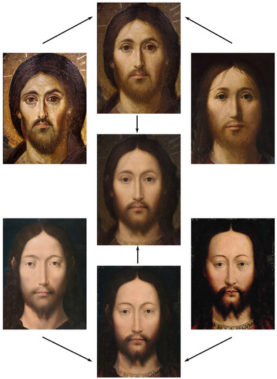 The construction of a prototypical Jesus. The four images, left to right, top to bottom: Christ the Pantocrator, Monastery of Saint Catherine, Sinai, 6th century; Antonello da Messina, Holy Face/Christ blessing, National Gallery, London (apparently dated 1465); Hans Memling, Holy Face, Norton Simon museum, Pasadena (1478); and after Jan van Eyck, Holy Face, Gemäldegalerie, Berlin (1438).