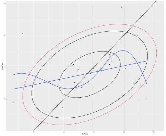 Figure 2 shows the relation between average scores for each image, for like and trust. The ellipses show the 50%, 90%, and 95% confidence intervals. There are no linear correlations. The black line shows a hypothetical one-to-one relation. The blue line is the linear trend line (not significant). The smooth curve shows that there is some structure, but it is not linear. When the like score is low (more liked), the trust score is up (less liked). In the middle range, we see that as the like ranking gets lower (score is higher), the trust also goes up (more distrusted). Finally, the extremely disliked images become more trusted again, but the last point is an outlier. Within the 90% confidence interval, there is a strong correlation for the more typical faces, i.e., like scores are larger than 5 and smaller than 22, and trust scores are larger than 5 and smaller than 19. This removes all the prototypes, except H2 and Jesus. It also removes Male 5, which is a clear outlier. This gives a significant non-parametric correlation (Spearman’s rho = 0.60, S = 616, p = 0.0040) for the more typical faces. This mirrors the prediction of Sofer et al. [14] that typical faces are more positively evaluated for both like and trust. However, the faces in our data are very similar, and we did not aim to create a gradual incline from unattractive to very attractive. Thus, the typical faces may emerge from exposure.