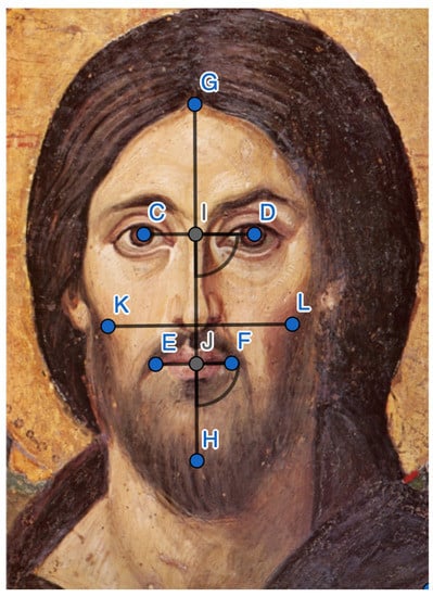 A simple model of face proportions was constructed in GeoGebra [22]. The first vertical line is drawn from the midpoint (G) of the highest point of the forehead to the lowest point of the chin (H), constructed such that it follows the nose and passes through the infra-nasal depression (the philtrum) as centrally as possible. The width of the face is estimated by locating the zygomaticus bone, guided by the lower earlobes and the tip of the nose, resulting in the line K-L. The width of the eyes is measured by the line C-D, and symmetry of the eye is measured by comparing C-I to I-D, and the angle of the eye-line to the vertical line. The width of the mouth is similarly constructed by the line E-F, found by locating the oral angles (anguli oris) and aligning the line between the upper and lower lip. Mouth symmetry is similarly determined by comparing the distance E-J to J-F, and noting the angle of the mouth line to the vertical line.