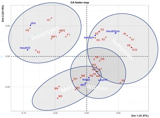 In Figure 4, we see how anatomical features cluster using a Correspondence Analysis. This demonstrates that the images contain (anatomical) information that makes it possible to differentiate the individual images and detect group differences. Some relevant subgroups are indicated. The prototypes are clearly distinct from the individualized faces. The Romanian students form one recognizable subgroup, with an overlap with women (possibly because there were more women in this subgroup). The Jesus prototype (Je) is central in the Romanian subgroup. Men and women form partly overlapping subgroups, using this set of features. The main dimensions are associated with the more extreme points: along the x-axis, we see mouth width to mouth symmetry, and along the y-axis, we see eye width to eye symmetry. The MID-section is also associated with eyes, and thus gaze. Apparently, the groups separate well, and the two dimensions account for 85.76% of the variance (51.57 + 34.19).