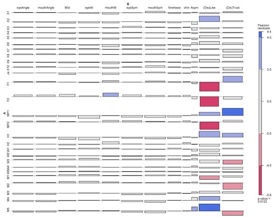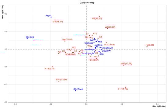 We see that many anatomical features related to eye and mouth and central face areas contribute to the like side, which may mirror the expressiveness of, and our innate interest in, eyes and mouths. A smile can be noticed at the eyes and at the mouth, and so can a smirk. The graph indicates that there is not a direct one-to-one mapping of facial anatomy to judgments of beauty and trust but rather a holistic impression considering many factors. The association graph (Figure 6) show which features are over and under-represented for which images. The female prototypes are strongly disassociated with dislike (i.e., associated with like). From the other features, we can also see how similar they are (i.e., the bars go in the same direction). The main difference is an association with mouth width, although many other features are also somewhat stronger for F2 (see Figure 6). The M5 has a strong association with asymmetry, which may explain why this image was less liked. We also observe that there sometimes is a dissociation between like and trust, noted by the different direction for dislike and distrust shown in Figure 6.