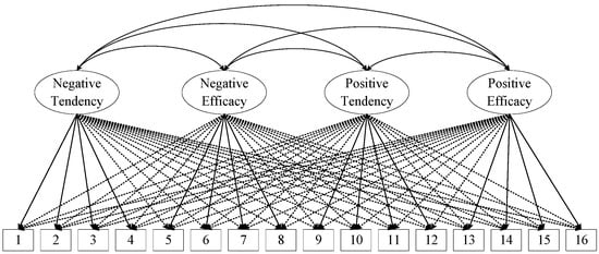 | Item | Model with One General Factor | Bifactor Model | Model with Two Higher-Order Factors (Tendency and Efficacy) | Model with Two Higher-Order Factors (Positive and Negative) | ||||||||||||||||||