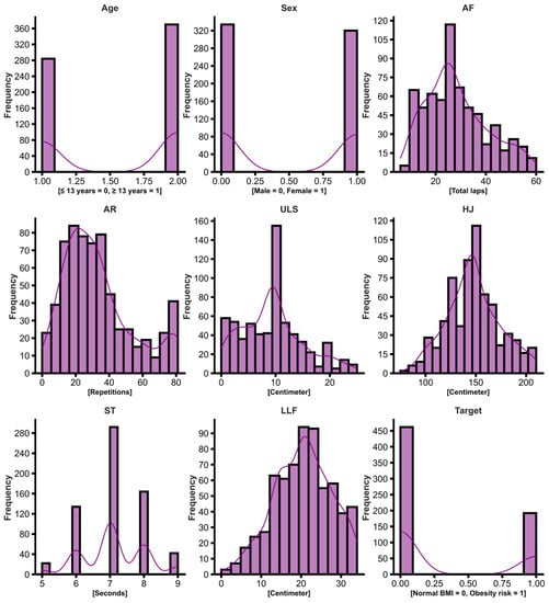 Histogram showing the frequency of subjects in each independent variable, Age, Sex, AF, AR, ULS, HJ, ST, LLF, and the Target variable (obesity risk classification according to BMI percentiles, 0 = negative, 1 = positive).