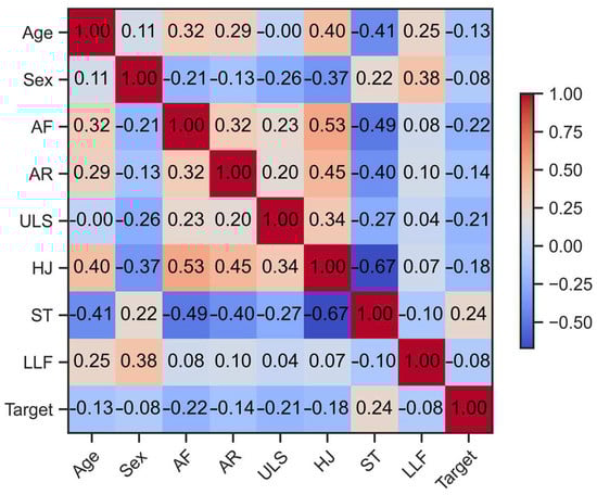 Correlation matrix of explicative variables Age, Sex, AF, AR ULS, HJ, ST, LLF, and the Target variable (obesity classification according to BMI percentile values).