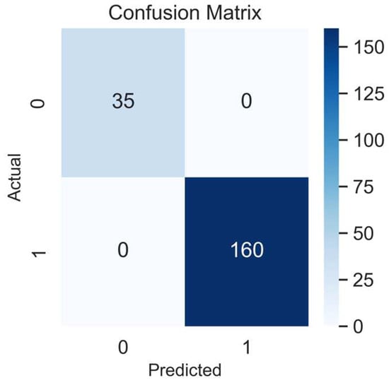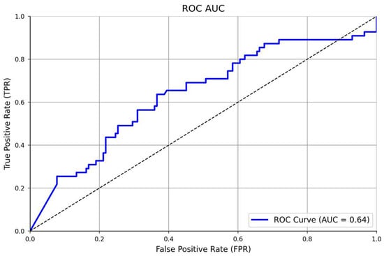 We started the epoch’s number with 24 units (three times the number of columns in the dataset), based on a study by Shahriari et al. [], which provides information about the larger variability of the accuracy performance over different epochs units. Then, after comparing 24, 50, and 100 epochs, the model’s accuracy did not improve; thus, in a simplified manner, we selected 24 units for the final training model. In addition, the confusion matrix showed an accuracy of 100%, being perfect for identifying all true positives (160), and all the true negatives (n = 35), Figure 4. In addition, the ROC AUC analysis presented a satisfactory model performance evaluation (64%) in finding the true positive and negative cases, Figure 5. The full NNET’s programming script can be found in the Supplementary Material (Script S1).
