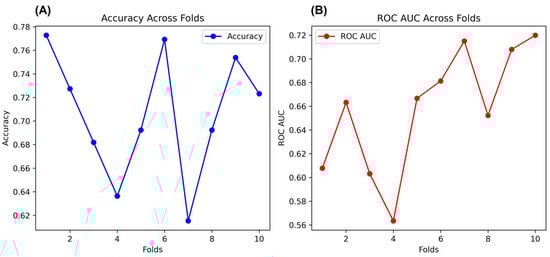 Cross-validation of the NNET. Figures (A,B) show the accuracy and ROC AUC, respectively, across the folds.