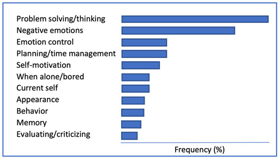Another way to answer the question consists of looking at what people report typically talking to themselves about and imagining a psychological world without these contents. In our work (e.g., [9,101]), we use an open-format measure aimed at collecting self-reported instances of naturally occurring inner speech in response to three probes: I talk to myself about (topics), when (during activities), and in order to (functions). Volunteers (students) freely list their recalled inner speech topics and functions, as presented in Figure 1. Table 2 displays less frequently reported contents.