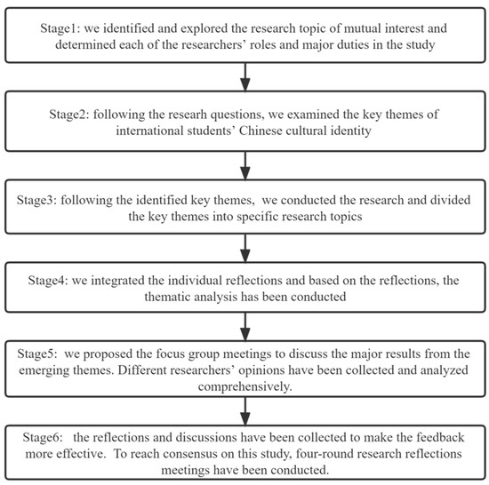 In this study, following the research procedures for collaborative autoethnography, we generated six stages that we planned to undertake. In the first stage, we started to identify and explore the research topic of mutual interest to the researchers involved and to determine each of their roles and major duties in the study. In the second stage, we followed the research questions to examine the key themes regarding international students’ adjustment to Chinese culture. Key stakeholder engagement has been included in our study and is based on the proposed key stakeholders involved in international students’ adjustment to Chinese culture. In the meantime, we also discussed the uncertainties faced by international students in China, especially during the post-COVID-19 period. The researchers comprehensively explored the challenges and difficulties associated with adopting this approach. In the third stage, following the identified key themes, we conducted the research and divided the key themes into specific research topics. Then, we integrated the individual reflections and, based on them, conducted the thematic analysis accordingly. In this stage, after conducting the interviews, based on previous relevant studies and analysis of the current interview transcripts with a view to exploring issues related to the adjustment to Chinese culture and mental health issues among foreign students on Chinese campuses during the COVID-19 pandemic, we conducted a screening for key themes that followed two principles: one looked for high-frequency words, and the other identified the key themes of discussion in key sentences, including summarizing sentences, looking for the viewpoints of sentences, and assessing the attitudinal tendencies of sentences. For analysis of this type, the NVivo software is intended as a way of collecting a wide range of materials and gathering information about common activities.