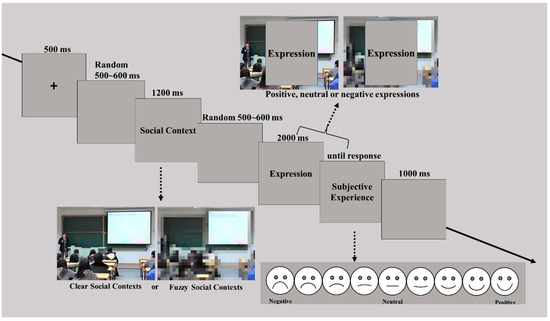However, previous studies on emotional contagion do not focus on the importance of social context. Instead, they place greater emphasis on the characteristics of the expresser or receiver, such as eye orientation [15], face attractiveness [16], and so on, or on the relationship between the expresser and the receiver, such as intergroup relations [17,18]. As mentioned by Hess, social context is often excluded as an experimental distractor in these studies [9]. For instance, subjects are presented with carefully cropped images in advance, showing only facial parts [15,17], or even elliptical faces without hair [15,19,20], in order to minimize contextual information. However, we believe it is necessary to explore the influence of social context on emotional contagion. This is because the occurrence of emotional contagion is inherently tied to social context, and removing the social context would result in the absence of the complete background of emotional contagion, making it difficult to generalize the research findings to a broader scope. Moreover, social context can provide essential information for the occurrence of emotional contagion, such as whether the environment is safe and whether the emotional response is appropriate. Consistent with our viewpoint, Fischer et al. (2003) also mentioned in their relationship model between emotion and social context that the events triggering emotions and the social context in which emotional events occur are equally important. Social contexts and emotional events are often appraised together by individuals, thus becoming part of individual emotional responses [21].