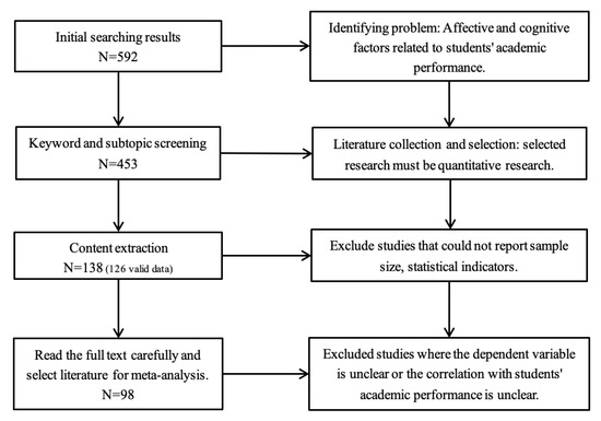 The article selection process consisted of several stages. In the initial stage of searching, we used keywords related to affective and cognitive factors in relation to students’ academic performance. During this stage, 592 publications were selected based on their relevance to research themes. In the second stage of keywords and subtopic screening, among the selected 592 publications, we re-selected the key samples and deleted the non-quantitative studies, and at last, 453 publications were selected to meet the method criteria. In the third stage, we excluded the irrelevant publications that could not report the sample size and accurate statistical indicators. In the content extraction stage, 138 selected samples were selected. Among them, 12 (6.42%) were related to the research topic but did not report data. By the end, we eliminated studies with unclear dependent variables or unclear correlations between dependent variables and students’ academic studies, and a total of 98 publications were finally selected for the meta-analysis (See Figure 1).