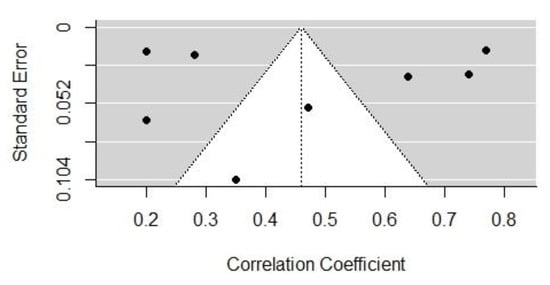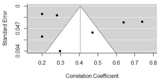 Figure 2 and Figure 3 show the funnel plots of the effect sizes of the two influencing factors, cognitive dominance, and emotional dominance, respectively. According to the image analysis, the funnel plots were basically symmetrical and, thus, there was no obvious publication bias. However, since the funnel plot is a more subjective judgment method that may not always provide consistent reliability, this study employed a combination of the Egger’s regression test and the assessment of publication bias using Rosenthal’s fail-safe number. The black dots mean the correlated distribution of the selected sample.