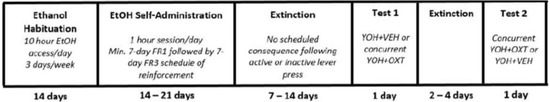 Timeline depicting the experimental paradigm across Experiments 1 and 2. All animals underwent ethanol habituation followed by ethanol self-administration, extinction, and reinstatement testing. YOH = yohimbine; VEH = vehicle; OXT = oxytocin.