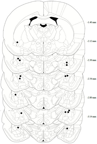 After completing both reinstatement tests, the rats’ brains were collected for histological assessment of the cannula placement. In brief, the rats were deeply anesthetized with phenytoin/pentobarbital, then transcardially perfused with 150–200 mL of cold 0.9% PBS, followed by 200–300 mL of 10% formalin. The rats were decapitated, then the brains were removed and post-fixed in 10% formalin for 24 h, submerged in 20% sucrose for 48 h, and then sectioned on a cryostat at 40 μm and collected on microscope slides. Tissue slices were stained with Cresyl Violet, and a CeA internal cannula placement was confirmed using the rat brain in Stereotaxic Coordinates Atlas, 7th edition (Figure 2). Two animals were removed from the study following confirmation of missed cannula placements.