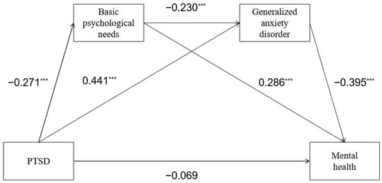As illustrated in Figure 2, PTSD was not significantly related to mental health after introducing the chain mediating variables of basic psychological needs and generalized anxiety disorder, indicating that basic psychological needs and generalized anxiety disorder fully mediated the effect of PTSD on the mental health of Chinese college athletes.