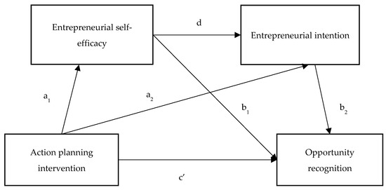 Action planning is composed of “what,” “when,” “where,” and “how” components; it is expected to pass through the self-regulatory process [72] and to require the deliberate processes of decision-making and self-evaluation. This intervention is expected to increase both motivational and volitional change [9]. In the field of entrepreneurship, ESE has been adopted in diverse entrepreneurial intention models based on SCT [73]. Intention has mostly been used as a mediator in behavioral change models, treated as a turning point between the initial goal-setting phase and the pursuit phase [9]. Self-efficacy also resembles perceived behavioral control and is used interchangeably or as an extension to predict behavioral intention [74]. Self-efficacy is required during the behavioral change phase to master different tasks. In a prior study, self-management cues and follow-up assessments performed after three weeks showed that self-efficacy and intention served as sequential mediators between intervention and dental-flossing behavior [9]. In another study, compared to the control group, participants in the intervention groups gained higher self-efficacy and increased their intentions for fruit and vegetable consumption and lifestyle changes [51]. Both self-efficacy and intention serve as mediators to alter behavior when planning interventions. By utilizing an API after the main EE training, entrepreneurship self-efficacy is expected to develop further, thereby increasing entrepreneurship intention to enhance opportunity recognition by students, showing the whole process of the motivational path from action planning to opportunity recognition.
