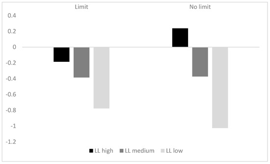 A repeated-measures ANOVAs on the two groups of participants showed a significant main effect of sales volume. There was a significant difference in participants’ choices at different levels of sales volume, F (2, 244) = 39.359, p < 0.001, ηp2 = 0.244, MLL high = 6.17, MLL medium = 5.08, MLL low = 3.90. Post hoc multiple comparisons showed that participants in the LL high group (M = 6.15, SD = 0.28) chose the LL option significantly more often than the LL medium group (M = 5.08, SD = 0.24) and the LL low group (M = 3.92, SD = 0.24), ps < 0.001. The main effect of limited quantity was not significant, and there was no significant difference between participants’ choices in the limit and no limit groups (p > 0.05). The interaction effect between limited quantity and sales volume was significant, F (2, 244) = 8.779, p < 0.001, ηp2 = 0.067.