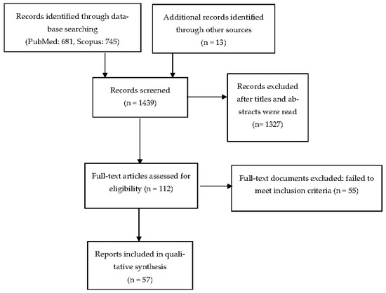 A total of 1439 records were screened through PubMed (n = 681), Scopus (n = 745), and reference lists (n = 13). Fifty-seven studies were ultimately included.
