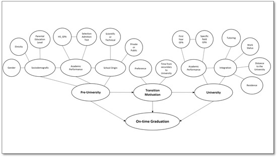 Despite the limited international literature around on-time graduation, there is an interest in higher learning institutions to improve levels of excellence, recognizing the complexity of graduation processes [26]. It has been found that on-time graduation is a multifactorial process that includes individual and collective factors at the personal and institutional levels [27,28,29]. On the other hand, Vain [6] emphasizes the importance of analyzing education trajectories towards on-time graduation and considering the factors that affect students’ behavior while attending university. Related studies identify important variables for graduating, such as the parents’ socioeconomic and education levels, school origin, and gender [11,30,31,32,33,34,35,36], as well as belonging to an ethnic minority [37,38]. In addition, it has been suggested that students with weaker preparation have a lower university graduation rate and a higher dropout rate [11]. However, students’ initial preparation and other entry conditions only partially explain low graduation, as resources and institutional support strategies have a significant impact on university student success [11,31,34].