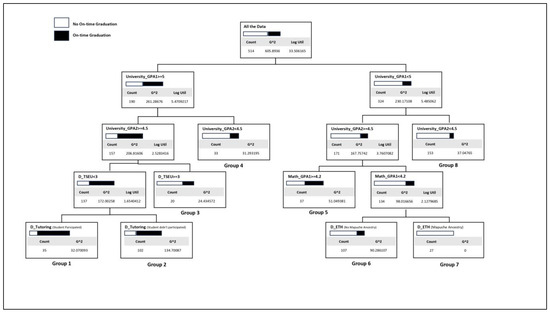 The CART analysis identified eight groups of students differentiated by their ability to graduate on time. The root node represents the total population (514 students), of which only 28% graduated on time. The root node was divided into two child nodes according to the value of the University_GPA1 variable. The left child node, with a high University_GPA1 (equal to or greater than 5.0), groups 37% of the population and is associated with high performance and high on-time graduation. This node gave rise to terminal groups 1, 2, 3, and 4. The right child node, with a low University_GPA1 (below 5.0), is associated with a middle or low performance and low on-time graduation, and groups 63% of the population. This node gave rise to terminal groups 5, 6, 7, and 8. Generally, groups 1 and 2 have a higher-than-average on-time graduation, whereas groups 4, 6, 7, and 8 have a lower-than-average on-time graduation, with group 7 standing out for having no student graduating on time. Table 5 summarizes the characteristics of each of the terminal groups.