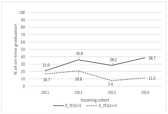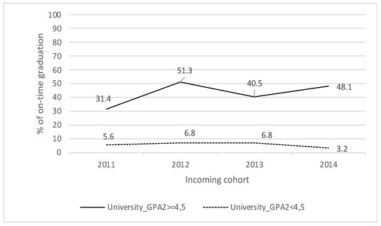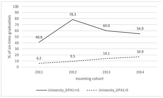 Figure 3 shows that when the students obtained a University_GPA1 equal to or greater than 5.0, the rate of on-time graduation is more than 35% higher (2011: 34.6%; 2012: 68.8%). Figure 4, on the other hand, shows that when the students obtained a University_GPA2 equal to or greater than 4.5, the on-time graduation rate is more than 25% higher (2011: 25.8%; 2014: 44.9%). These differences in on-time graduation indicate that students with better performance in the first year at university are more likely to graduate on time.