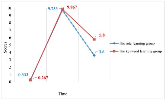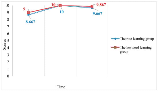 The keyword method (KWM) is one of many mnemonic vocabulary learning strategies (VLSs) used for deliberate vocabulary learning. The KWM is an image mnemonic that combines two items together, so one item will be recalled when the other item is thought about. Atkinson [] explained that the KWM involves a two-stage process. Stage one is to associate an L2 foreign word with an L1 keyword that sounds like part of the L2 foreign word, while stage two entails the learner “form[ing] a mental image of the keyword ‘interacting’ with the” L1 definition [] (p. 2). For example, the English word “beauty” sounds like the Mandarin Chinese word “bítì” (meaning “snot”), so we may employ the word “bítì” as the keyword that evokes the image: “[t]he beauty is blowing snot out of her nose”. Although a sizable number of studies [,,,,,,,,,] have investigated the effectiveness of the KWM for vocabulary learning, a precursory look at the published literature shows that it has been underrated by language learners and teachers and under researched by SLA scholars. As one of many mnemonics used by language learners to assist in the deliberate learning of vocabulary, the KWM may have the potential to aid in the long-term retention of English collocations. Furthermore, as most first-language (L1) Chinese speakers use rote learning to master L2 collocations [], it would be interesting to know whether the commonly applied rote learning method (RLM) would be as effective as the use of the KWM for the learning of English collocations. In the SLA literature, the RLM can contribute to the “acquisition, storage or retrieval” [] (p. 235) of new language knowledge and has been understood as one of the many VLSs that cover repetition, practice, and memorization []. Taking the English word “beauty”, again, as an example, leaners using the RLM would first look at the L2 word’s spelling, then look at the L1 definition, and finally read and then write down the target word and its L1 definition repeatedly. In fact, previous research has been conducted in which the effectiveness of the RLM for individual word learning has been compared to different mnemonic VLSs (e.g., the KWM [,], using flash cards [], and context learning []). Unlike learning by rote, when applying the KWM, learners need to identify the keyword and create an interactive image between the keyword and the foreign word, so the RLM can be considered a more general language learning strategy, while the KWM can be considered a more specific vocabulary learning strategy (VLS) [,,]. Therefore, it is important to compare these two strategies’ effectiveness for collocation learning to enrich research findings for the field of vocabulary studies.