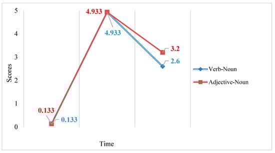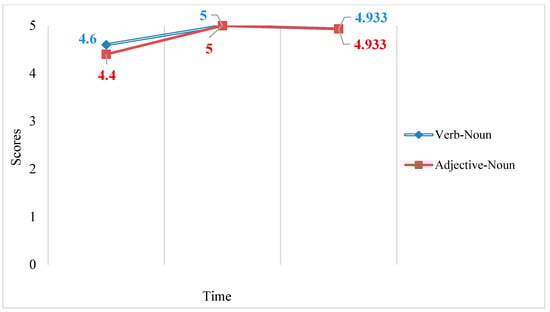 5.2. RQ2: Which Type of English Collocations Can Be Learned More Effectively by Using the KWM: Verb–Noun or Adjective–Noun Collocations?