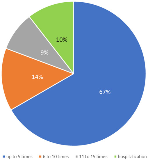 Finally, responses from participants who once sought help from professionals related to their diagnosis of an eating disorder were analyzed. A constructed questionnaire on perceived quality of support collected data on how familiar participants were with existence of centers/associations for individuals with eating disorders near them. Of the respondents, 48.8% answered affirmatively to the posed question, 33.7% stated that there were no such institutions near them, and 17.4% were not sure if such institutions existed or not near them. Then, they were asked whether they had ever sought help from such centers or associations, and 66.3% stated that they had sought professional help. Data on how many times participants who answered positively to the previous question sought professional help were grouped into four categories (Figure 1). Participants who could not specify data on exact number reported short-term or long-term hospitalizations related to the diagnosis of an eating disorder in the last two years.