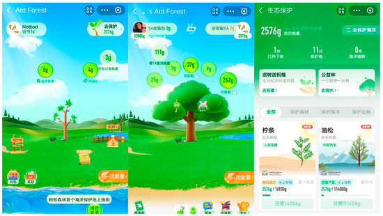 Ant Group, for instance, launched its Ant Forest mobile application built with big data and AI technology in 2016. The application’s objective is to prompt the public in practicing sustainable consumption behavior while also addressing climate change and environmental issues. The application encourages the public to walk instead of driving and to purchase tickets online to reduce carbon emissions. The carbon saved is calculated by means of virtual computing and transformed into “green energy” to plant virtual trees within the application. When these virtual trees grow, Ant Forest plants a real one on the earth to cultivate and incentivize low-carbon environmental behaviors. Furthermore, Ant Forest has incorporated diverse interactive elements, such as energy theft, watering assistance, co-planting, energy competitions, and leaderboards, among others, to enhance the immersive gaming experience and foster emotional communication [9]. Figure 1 illustrates some application functionalities. In this way, effective promotion of green consumption habits can be achieved, and consumer behaviors towards sustainable consumption can be guided. The Ant Forest has garnered substantial involvement from a large number of Chinese citizens and, owing to its significant contributions to environmental conservation, received the esteemed United Nations’ “Earth Champion Award” on 26 September 2019. According to Ant Group’s 2022 Sustainable Development Report, there are more than 650 million users in “Ant Forest” who have embraced a green and low-carbon lifestyle. As a result, they have collectively generated over 26 million tons of “green energy”. These users have successfully planted 400 million trees and protected a social welfare area of 2 million hectares, with the help of applications and funding provided by Ant Group. Despite the noteworthy accomplishments of Ant Forest, it still requires empirical evidence to determine if its users are able to uphold sustainable consumption practices offline, comparable to their behaviors online. Hence, it is crucial to ascertain the potential influence of Ant Forest users’ online environmental behaviors on their offline sustainable consumption practices.