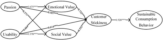 Table 7 shows that the indirect effect of “passion → emotional value → customer stickiness → sustainable consumption behavior” is estimated to be 0.125 with a 95% Bootstrap confidence interval that excludes zero. This suggests that emotional value and customer stickiness have a mediational role between passion and sustainable consumption behavior, thus supporting hypothesis H5a. The indirect effect of “passion → social value → customer stickiness → sustainable consumption behavior” is estimated to be 0.043 with a 95% Bootstrap confidence interval that excludes zero. This suggests that social value and customer stickiness have a mediational role between passion and sustainable consumption behavior, thus providing support to hypothesis H5b. The indirect effect of “passion → social value → customer stickiness → sustainable consumption behavior” is estimated to be 0.043 with a 95% Bootstrap confidence interval that excludes zero. This suggests that social value and customer stickiness have a mediational role between passion and sustainable consumption behavior, thus providing support to hypothesis H5b. The indirect effect of “usability → emotional value → customer stickiness → sustainable consumption behavior” is estimated to be 0.106 with a 95% Bootstrap confidence interval that excludes zero. This suggests that emotional value and customer stickiness play a mediating role between usability and sustainable consumption behavior, providing evidence for hypothesis H6a. The indirect effect value of the path “usability → social value → customer stickiness → sustainable consumption behavior” was found to be 0.04 with a 95% Bootstrap confidence interval that did not include 0. This suggests that both social value and customer stickiness serve as mediators between usability and sustainable consumption behavior, therefore supporting hypothesis H6b.