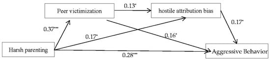Final model illustrates the chain mediation of peer victimization and hostile attribution bias on the association between harsh parenting and aggressive behavior. * p < 0.05; *** p < 0.001.
