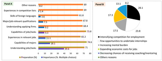 However, their preparation level for careers was generally low at 61.8–74.6%, and the skills of foreign language and performing an internship were also low (Panel B in Figure 1). Their main difficulties in preparing for employment were intensifying competition for jobs (28.1%), decreasing/lacking opportunities for work experience (e.g., internships: 23.8%), and an increasing psychological burden for developing careers (17.5%; Panel B in Figure 1).
