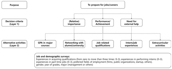 The results of AHP with a sample of 93 Korean undergraduates showed that their feeling of achievement was the most meaningful criterion. Extracurricular activities (e.g., participating in competition fairs) and internships were evaluated as the most valuable alternatives for job preparation. These findings could offer insights to students and universities in preparation for developing the students’ careers. Students’ desire for extracurricular activities and internships could be a missing element on which the existing university education does not focus sufficiently.