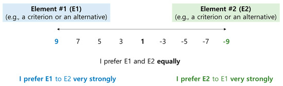 If the number of elements in a layer increases, the number of questions that respondents should answer (i.e., the size of the comparison matrix) also increases [24]. For example, the number range of elements (e.g., ) could be appropriate for respondents to compare because if the number is higher than seven, the increase in the value of random index (RI) becomes very small, and respondents may find it difficult to compare elements [27]. In addition, the increase in the number of elements and/or the degree of comparison scales (e.g., 1, 2, …, 9) could lead to the respondents’ burden to compare elements and the inconsistency of their comparison results [28]. Therefore, this study adopted a five-point comparison scale (that is, 1, 3, 5, 7, and 9. [28]) to compare the criteria and alternatives (Figure 3).