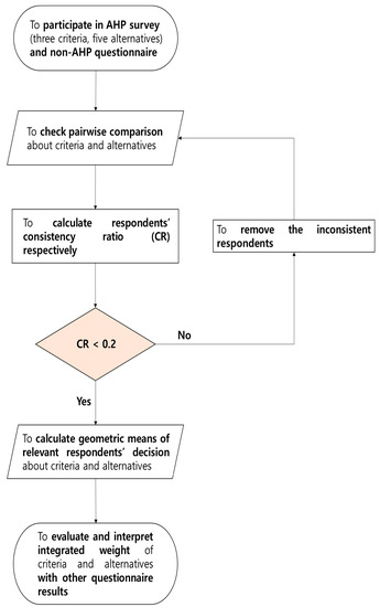 The AHP questionnaire was designed in accordance with the research model (Figure 2) and the analytic flow (Figure 4). This study established 33 AHP-related questions ( = 3 + 310) and eight demographic questions (Table 2). After designing the questionnaire and implementing the survey, the study drew the value of consistency ratio (CR) by calculating the values of the pairwise comparison between criteria and alternatives. For comparison results in which the CR values of respondents were lower than 0.2, the study established the weights of criteria and alternatives by using geometric means to synthesize the results.