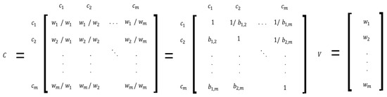 Reciprocity (e.g., (please see Figure 5)) and transitivity (e.g., .) must be preserved to be consistent with the comparison result [24,32]. Researchers can check the fulfillment of these conditions by comparing CR with some standard values (e.g., CR < 0.1 [23]). Random index (RI in Equation (3)) shows the probability value of a matrix composed of random numbers generated through simulation. The value (CR = 0.1) could denote that the probability of randomness is 10% in the pairwise comparison of the respondents’ judgment [30].