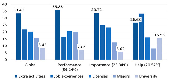 The results of the sub-analysis according to job-related factors (Figure 8, Figure 9 and Figure 10) show that students who do not have experience in internship evaluated the extracurricular activities as the most important both in the global and local results (Figure 8).