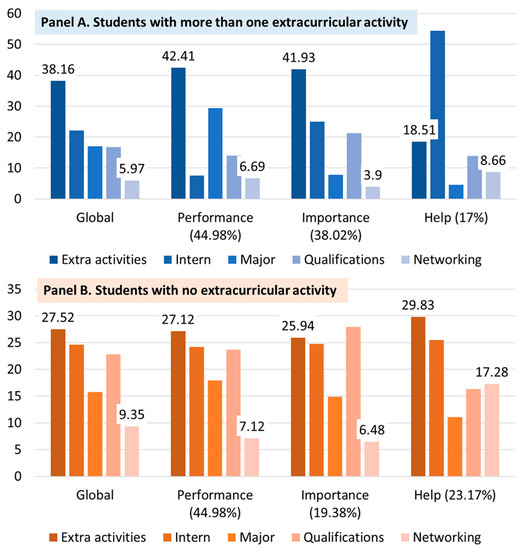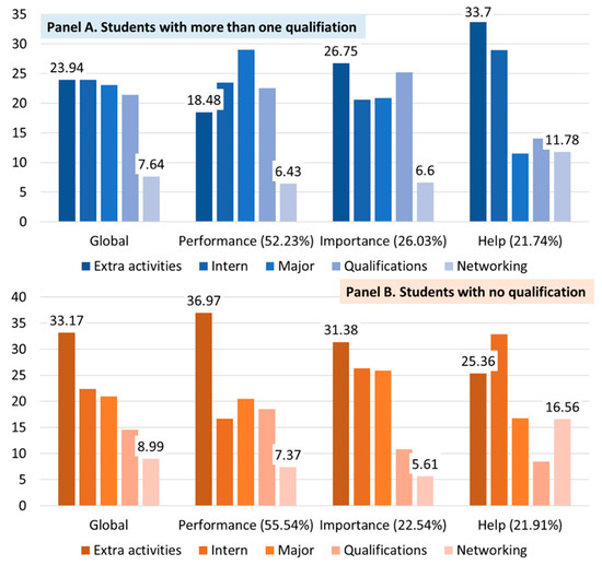 Networks with alumni/universities were rated as low in general. Students without qualifications (Panel B in Figure 9) and those with more than one qualification commonly evaluated extracurricular activities as the most important. However, the proportion implementing the activities showed a very large difference in weight from other activities; it was evaluated as the most meaningful in terms of performance and importance. Job-related experience was rated highly based on the criterion of the need for external help.