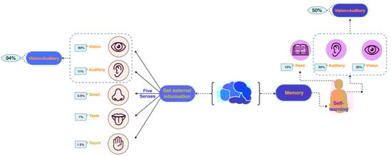 With the further development of marketing research and the gradual introduction of psychological research results, sensory marketing has become familiar to the public. What consumers buy is no longer the product itself, but also the various sensory stimuli and experiences in the consumption process. Krishna [,] proposed a complete theory of sensory marketing, which means that sensory marketing is a marketing approach that incorporates the five sensory experiences of consumers (touch, sight, taste, smell, and auditory) and influences their perception, judgment, and behavior. All the senses receive different amounts of information. Treicher, a famous experimental psychologist, showed that humans get external information through the five senses. Of these, 1% comes from taste, 1.5% from touch, 3.5% from smell, 11% from auditory, 83% from vision, and 94% from sight and sound combined. Additionally, he outlined the hypothesis that most people can remember 10% of their reading content, 20% of their auditory content, 30% of their visual content, and 50% of their visual and auditory content. This shows that the combination of audio–visual design in logo design provides an advantage for the interaction between corporate brands and consumers [], as shown in Figure 1.