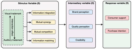 Using the keywords “sensory marketing”, “visual logo”, “auditory logo”, and “social media” on CNKI and Google Scholar Interaction search the literature for the interaction effect of the visual logo and the auditory logo. Using the theory of sensory marketing and the theory of audio–visual interaction stimulation and based on An Xingwei et al. [] research results, the questionnaire was compiled. Additionally, a study was carried out on the integration of related data, mutual synergy, mutual competition, and matching degree of audio–visual interaction stimulus in brand logos, along with social media’s media role. Russell and Mehrabian [] proposed the SOR model, which is a “stimulus-organism-response” model, in which stimulus (S) refers to the driving force that may influence consumers’ cognitive processes and is an external factor related to consumers’ decision-making behavior. Organism (O) involves the processes and structures within the individual between the stimulus and the final behavior and response, which consists of human emotions and cognition. As a result of the consumer’s response (R), a consumer’s final attitude or behavior is described by Gatautis et al. []. Specifically, this study took the four aspects of the interaction effect that affect vision and auditory as stimulus variables, the impact of information integration, mutual synergy, mutual competition, and information matching, took consumer perception, quality perception, and credibility of the brand as mediating variables, and consumer perception of brand and purchase intention as response variables. Figure 2 shows the research model.