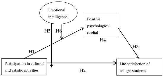 With the continuous development of science and technology, education, and culture, cultural and artistic activities are increasingly integrated into people’s daily lives. The cultural and artistic activities of college students—an important force in social development—are a significant part of campus culture construction []. Life satisfaction among college students, as an important element in their physical and mental health development, has received increasing attention from various educational organizations and scholars at home and abroad []. Previous studies have shown that the effective use of leisure time can provide personal, physical, and psychological benefits and improve interpersonal relationships, which can subsequently increase life satisfaction []. Notably, physical and mental health factors are important variables that influence individual life satisfaction. Good physical health increases not only participation in various activities but also life satisfaction []. The quality of interpersonal relationships is another variable that influences life satisfaction. Good interpersonal relationships and attachments, together with community involvement, are key factors in increasing life satisfaction []. Although previous studies support that PCAA is associated with personal health and life satisfaction [], they have not included PPC and EI as research variables; There is a need to expand on the intrinsic relationship and mechanism of action between both PPC and EI.