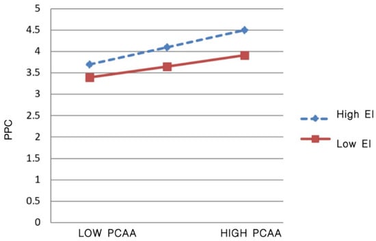From Table 7, the Model 1 data show that the interaction term product coefficient β of EI and PCAA is 0.044, with a confidence interval (LLCI = −0.004, ULCI = 0.092) containing 0. This proves that the moderating effect of EI on the relationship between PCAA and LSC is not significant. Thus, Hypothesis 5 is not supported. Data from Model 2 prove that EI moderates the relationship between PCAA and PPC, thereby implying that the moderating variable (EI) has a significant difference in the magnitude of the effect at different levels concerning the effect of PCAA participation on PPC, as shown in the simple slope plot (Figure 2).