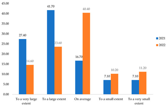 As previously shown, the first hypothesis (H1) claimed that the respondents became more responsible during the extended period of the COVID-19 pandemic. The assumption was confirmed through the research results. Thus, respondents were asked to what extent they believe they have become more responsible during the pandemic. It was found in 2021 that 27.40% thought they had become more reliable to a very large extent and 41.70% to a large extent. The percentages are higher compared to the statements from 2022. Also, in 2022, 40.40% considered that they were, on average, more responsible, while in 2021, only 16.70% thought that they were more accountable (Figure 2).