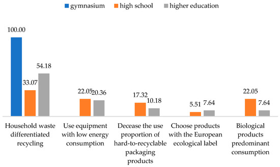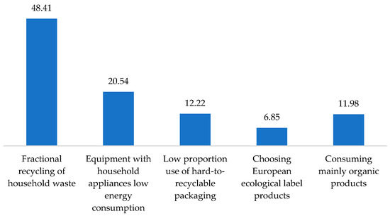 Considering these aspects, during the post-COVID period, we asked the respondents how they showed their responsibility towards the environment and through what kind of actions. Their answers were structured as follows: 48.41% differentiated household waste during recycling, 20.54% equipped their households with appliances that had low energy consumption, 12.22% used packaging that is easier to recycle, 12.22% preferred to consume mainly biological products, and 6.85% chose products with a European ecological label (Figure 4).