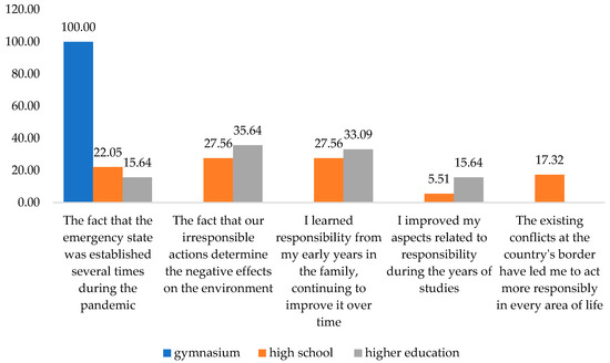 The research for this article started precisely from two essential aspects. Firstly, accountability can be seen as an element of assuming exclusive personal actions. Secondly, it is considered an effect of ethics toward fellow citizens and the environment. These aspects have been used a lot since the beginning of the pandemic. For this reason, we wanted to observe the initiating processes that increase responsibility. It is important to determine if some instruments or systems determine liability or if it results from the educational and learning system. It was also interesting to differentiate the family principle’s effectiveness and the one achieved across the academic route. This aspect was considered from different points of view, as presented in Figure 1.