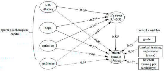 Previous studies suggested that athletes’ psychological capital level is related to life stress and burnout. Therefore, the purpose of this study was to explore the influences of university baseball athletes’ psychological capital on their life stress and burnout and provide practical suggestions for athletes and coaches to reduce their life stress and burnout. In this study, we used athletes’ control variables (grade, year of training experience, and training days per week) and psychological capital (self-efficacy, hope, optimism, and resilience) to predict their life stress and burnout. A total of 428 division I baseball athletes from 16 teams of the national college baseball sports league in Taiwan participated in this survey, with a return rate of 89.2%. Partial least squares structural equation modeling was used to test the relationships among the above-mentioned variables. The results showed that the athletes demographics such as grade (β = 0.03, p > 0.05) and years of baseball training experience (β = 0.00, p > 0.05) had no significant influences on athlete burnout, while the days of baseball training per week (β = 0.32, p < 0.05) had a positive influence on athlete burnout. As for psychological capital, self-efficacy (β = −0.09, p < 0.05), hope (β = −0.27, p < 0.05), and optimism (β = −0.20, p < 0.05) had negative influences on life stress, while resilience (β = −0.07, p > 0.05) had no significant influences on life stress. Hope (β = −0.20, p < 0.05) had negative influences on athlete burnout, while self-efficacy (β = −0.00, p > 0.05), optimism (β = −0.06, p > 0.05), and resilience (β = −0.01, p > 0.05) had no significant influences on athlete burnout. Life stress (β = 0.52, p < 0.05) had significant influences on the burnout. Based on our research findings, suggestions were made to reduce the athletes’ life stress and athlete burnout.