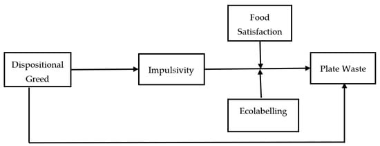 The UNEP Food Waste Index Report 2021 estimates that 931 million tons of food waste is generated globally each year. Of this, 61% comes from households, 26% from food service, and 13% from retail [8]. This amount of waste not only represents a significant economic loss but also contributes to environmental degradation [9]. This study focuses on the problem of plate waste, which is a critical type of food waste in the tourism and hospitality sector [10]. Nearly 30% of food waste in the tourism and hospitality sector is caused by plate waste [11]. Despite the growing interest in food waste in the literature, detailed studies on plate waste are lacking [12]. A significant part of the existing studies focuses on food waste in households [13,14,15], business practices [16], and wasted quantities [17]. Another topic that is just as important as the quantitative results of food waste is understanding consumers’ psychological reasons for food waste, a topic that represents a gap in the literature [18]. With this in mind, our study seeks to examine the impact of dispositional greed and impulsivity on plate waste while also assessing the moderating role of food satisfaction and ecolabeling. It seeks to contribute to the literature by examining the psychological factors that potentially drive plate waste behavior, thus filling a critical research gap.