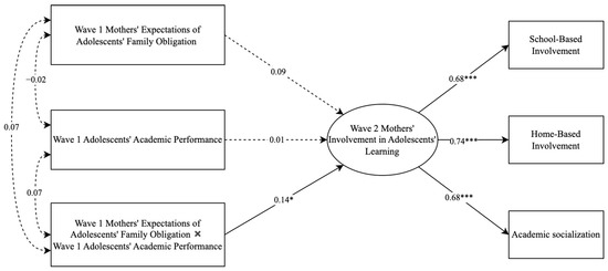 Structural equation modeling predicting mothers’ involvement in adolescents’ learning over time. Mothers’ expectations at Wave 1 were centered, and adolescents’ academic performance at Wave 1 was standardized within the same grade level before entering into the model. The model controlled for demographic covariates and mothers’ involvement in adolescents’ learning at Wave 1, which was also allowed to covary with the predictors but was not shown for clearer presentation. The standardized coefficients yielded by these analyses are presented. * p < 0.05. *** p < 0.001.