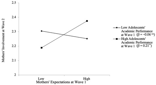 Adolescents’ academic performance moderated the longitudinal association between mothers’ expectations of adolescents’ family obligations and later involvement in adolescents’ learning. Mothers’ involvement at Wave 1 and demographic covariates (i.e., adolescents’ age, gender, grade, and mothers’ educational attainment) were controlled for in the analyses. Low and high adolescent academic performance (or mothers’ expectations of adolescents’ family obligations) are 1 SD below and above the mean. ** p < 0.01. ns = not significant.