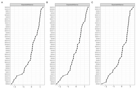 Figure 2 shows the standardized EI of all symptoms for all participants (Part A)—the low-neuroticism group (Part B), and the high-neuroticism group (Part C). The symptoms with a high standardized EI may be considered central symptoms. In the network of all participants, the standardized EI of “Faintness” (SAS12), “Paresthesias” (SAS14), and “Depressed affect” (SDS1) ranked in the top three. Among these three nodes, “Faintness” (SAS12) was also the node with the highest standardized EI in the high-neuroticism group, and “Paresthesias” (SAS14) also had a high standardized EI in the low-neuroticism group. Additionally, in the low-neuroticism group network, “Dissatisfaction” (SDS20) and “Dizziness” (SAS11) also showed high standardized EI. In the high-neuroticism group, “Hopelessness” (SDS14) and “Mental disintegration” (SAS4) revealed high standardized EI. The results of standardized strength were shown in Figure S1.